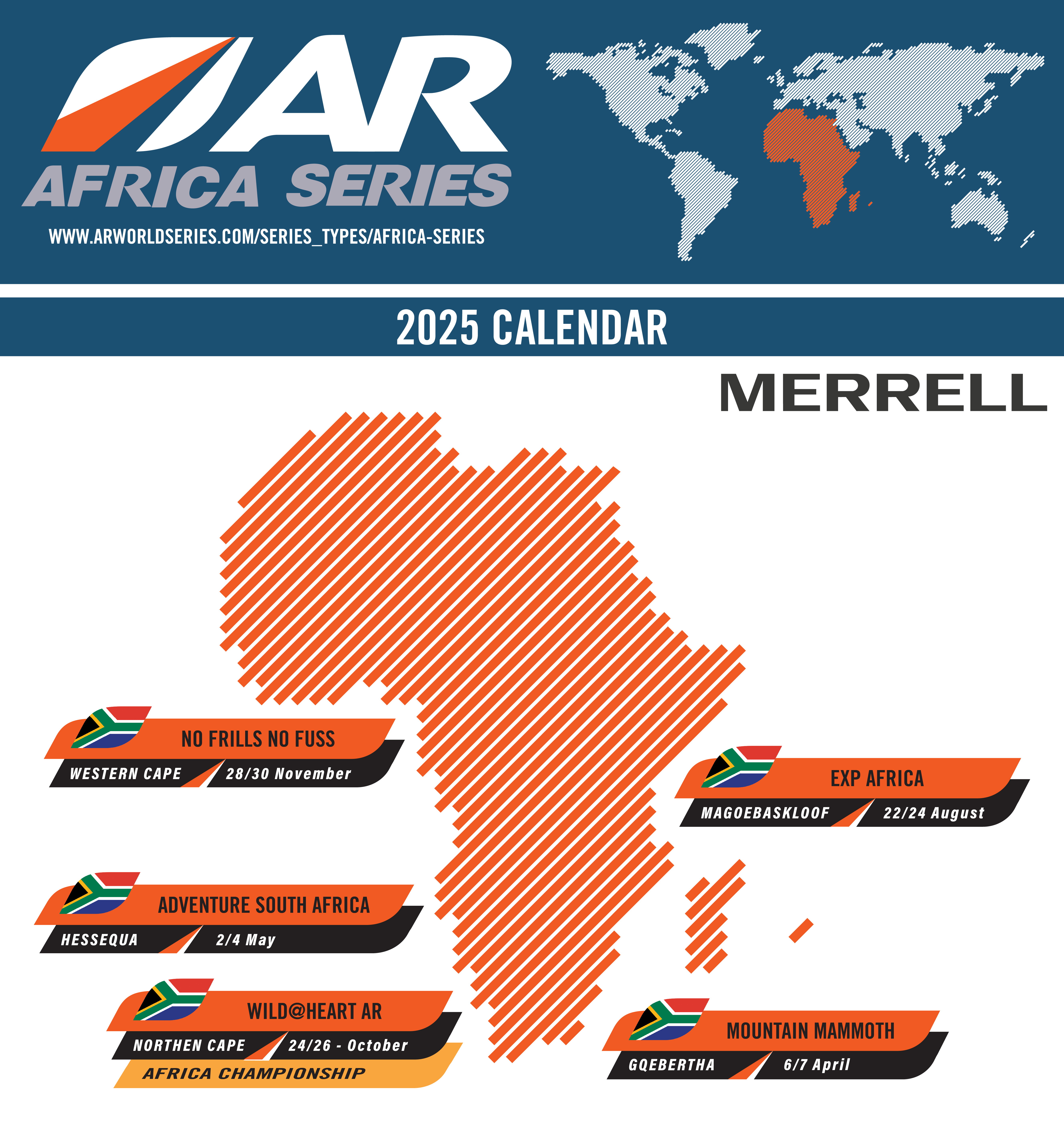 The Adventure Racing World Series Africa calendar for 2025 includes 5 events in a selection of stunning locations and is supported by Merrell South Africa, who are proud to invest in this healthy and thriving community.
